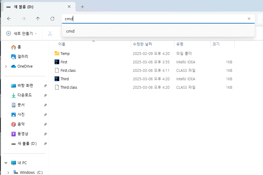 혹은 위 그림처럼 열고싶은 파일의 위치에서 cmd를 입력해도 이동할 수 있다.
