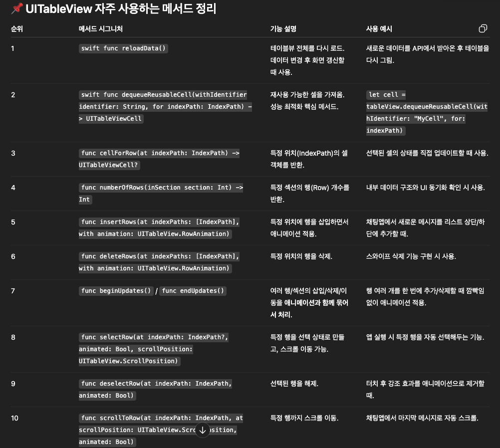 iOS 테이블뷰에서 많이 사용하는 메서드를 많이 사용하는 순서대로 나열하고 예를 들어 기능을 설명하고,