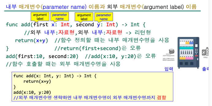 - 외부 매개변수명 (argument label): 함수를 호출할 때 인자를 구분하기 위해 사용.