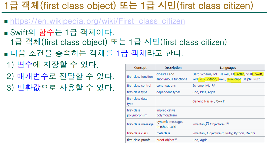 // Swift에서 함수는 "일급 객체(first-class citizen)"라서 변수/상수에 저장 가능