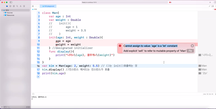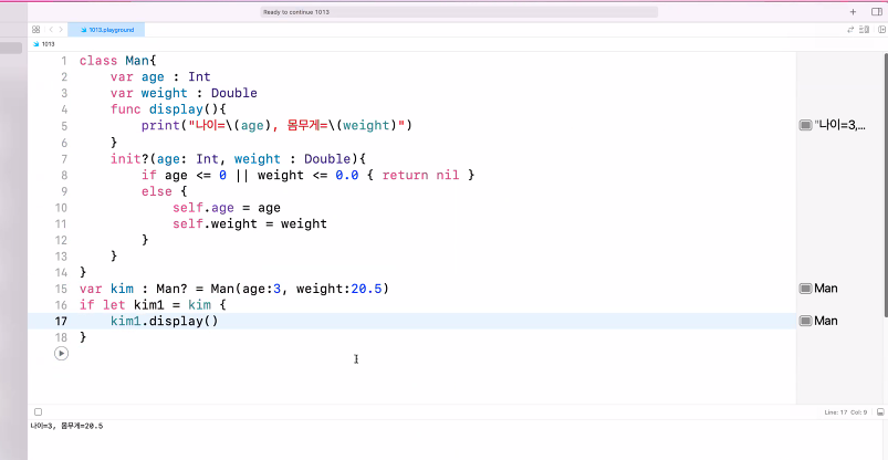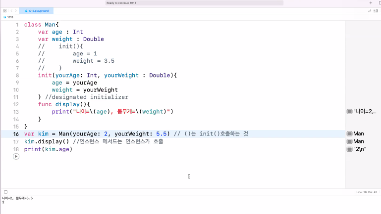 var age : Int var weight : Double init(){ //initializer로 초기화 age = 1 weight = 3.5 }} |