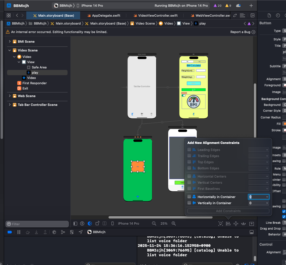 - 스택 뷰 제약 조건 추가: 이제 개별 뷰가 아닌, 스택 뷰 자체에 대해 1번 방법(핀 메뉴)을 사용하여 위치와 크기 제약 조건을 추가합니다. (예: 스택 뷰를 화면 중앙에 고정하고 너비를 설정)