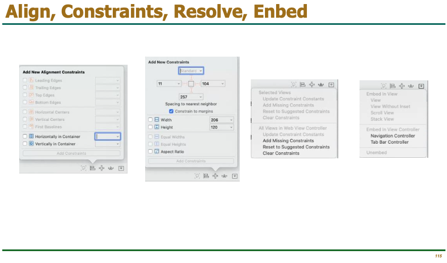 Xcode의 Interface Builder 오른쪽 하단에 있는 툴바를 사용하여 제약 조건을 가장 쉽고 빠르게 추가할 수 있습니다.