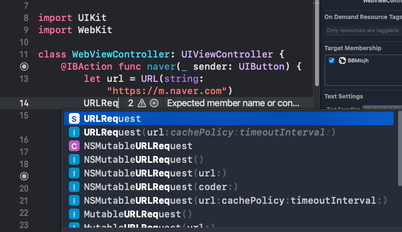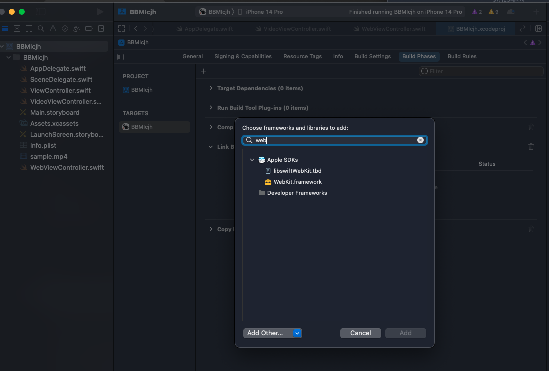 BBMIcjh -> Build Phases -> Choose frameworks and libraries to add: -> WebKit.framework
